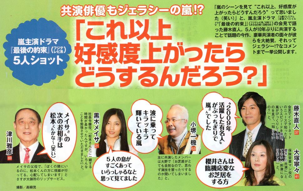 「DVDでーた」本日発売でした。(^∀^) てか、めっちゃ宣伝してますけど、 なんで?(^∀^) ライブDVDも、こんくらい宣伝したらいいのに。(^∀^) あと、女性セブンとTVfanも買いました。(^∀^) fanは、目次ページに藤木さんが。(^∀^) つってもですね、 藤木さん掲載ページがあるわけではなく、 「最後の約束」の写真が載ってて、たまたま藤木さんも一緒のシーンだったと。(^∀^) その「最後の約束」の紹介ページにも、ちょこちょこ映り込んでる。(^∀^) あとは、「泣かないもん」の相関図かな?(^∀^) 買ったけど、覚えてない。(^∀^) てか、携帯で撮ったからどれがどの写真かわからなくなったと言うのが現状。(^∀^) 多分、これがfanに載ってた相関図だったと思う。(^∀^) 間違ってたらスミマセン。(^∀^) で、女性セブン。 「共演俳優もジェラシーの嵐?!」 なかなか良いお題で。(^∀^) WSもこんくらい上手に取り上げてくれたらいいのに。(^∀^) 一応、補足しておくと ↑の画像、お題と共演者の間に嵐さんがいます。(^∀^) ちょこっと自重してみました。(^∀^) あ。 そうそう。 1月からBS日テレでホタルノヒカリの再放送が始まります。 このくらいかな?(^∀^) てか、 寒いねんっ!(#^∀^)゛o゛ 寒い中、買いに行ったのに3人かよ。(^∀^) な、一日でした。(^∀^) ★ 追記 ★ 「最後の約束」公式サイトと「泣かないもん」の公式サイト更新してたんですねー。(^∀^) ついでに、「TRICK 」も。(^∀^) ※藤木さん関してはどれも更新情報ナシです。(^∀^) PR