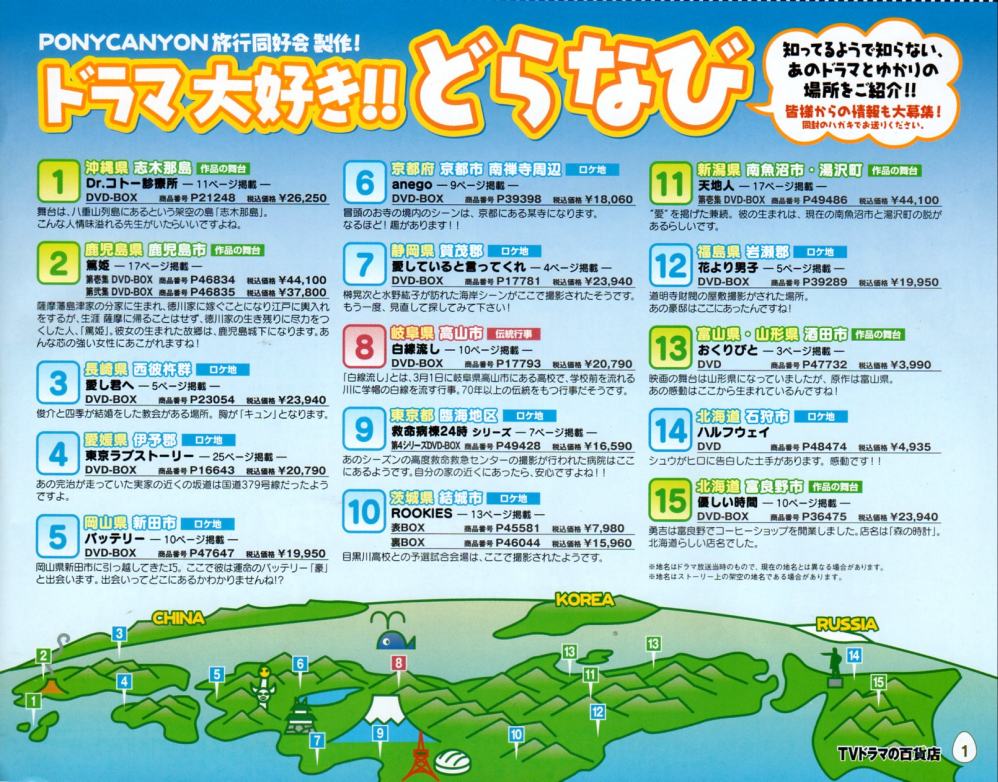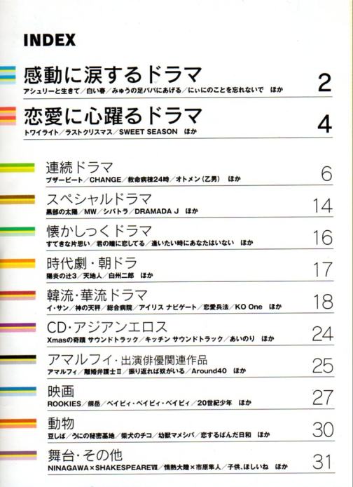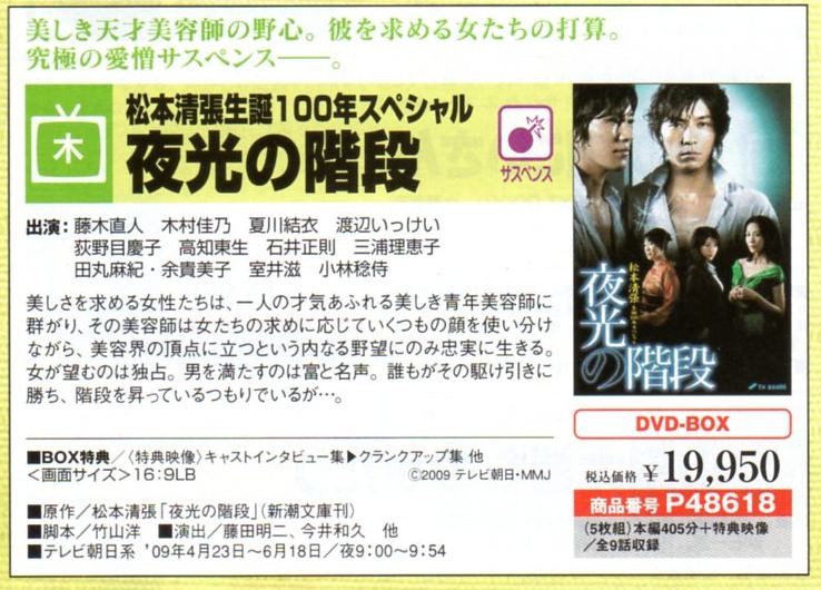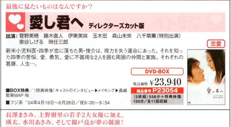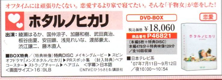 所謂、カタログっすね。(^∀^) ネタが無いと言うことです。(^∀^) いつもなら、そのままゴミ箱行きなんですが、「51」に反応してしまった(^∀^) 重症です。(^∀^) 内容はDVDの通販。(^∀^) ジャンル別にDVDを紹介してます♪ ■ 感動に涙するドラマ こちらには、「1リットルの涙」が掲載されてました。 ■ 恋愛に心躍るドラマ こちらには、「ホタルノヒカリ」と「愛し君へ」が。 あ。「P.S.元気です、俊平」も載ってる。(^∀^) 「初/体/験」も載せてよ~(^∀^) そうそう。 「愛し君へ」は、こちらにも載ってました。(^∀^) 特典映像ですね。 ■ 連続ドラマ こちらのジャンルには「アンティーク」と「夜光の階段」。 ■ スペシャルドラマ つい先日発売になった「シバトラSP」が掲載。(^∀^) ■ アマルフィ こちらに「Around40」が。(^∀^) ■ 映画 こちらには、20世紀とべいびーが載ってましたが、藤木さんの名前載ってなかったので割愛。(^∀^) アラフォーとべいびー以外は持ってる。(^∀^) あ。 昨日のテレビ誌ですが、「最後の約束」関連だけ、ついでにご紹介。 ジョンには藤木さんエピも載ってましたが、ガイドにはナシ(^∀^) それから、フォーマリストの公式サイトですが、 こちらからなら画像有りです。(^∀^) http://www.jafa-formal.jp/bestformalist/bestformalisut2009.html 最後に視聴率。 *9.5% 22:00-22:54 NTV ギネ 産婦人科の女たち *6.9% 21:00-21:54 TBS 水曜劇場・浅見光彦~最終章~ 18.5% 19:00-23:18 CX* 2009FNS歌謡祭 16.1% 21:00-21:54 EX* 相棒season8 PR
