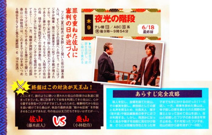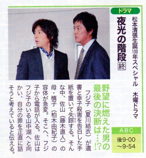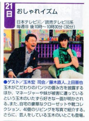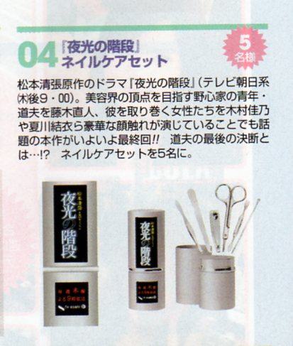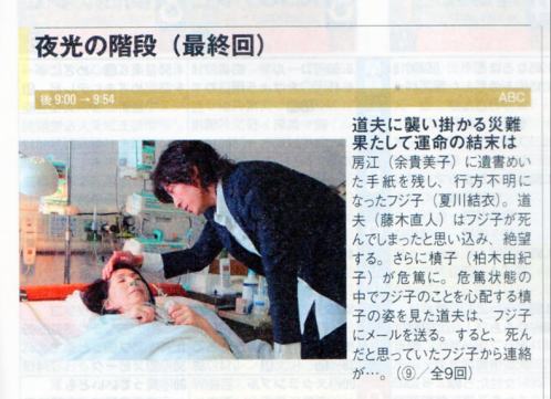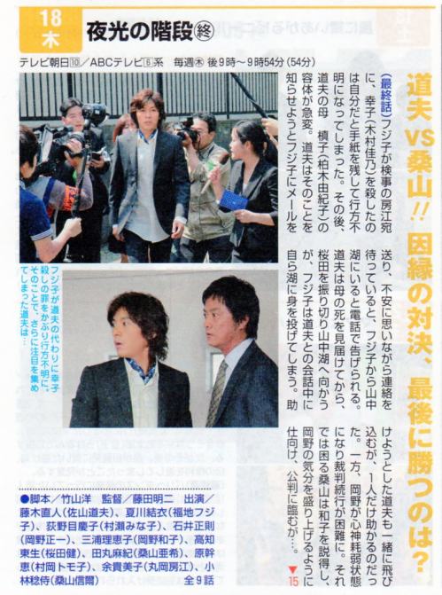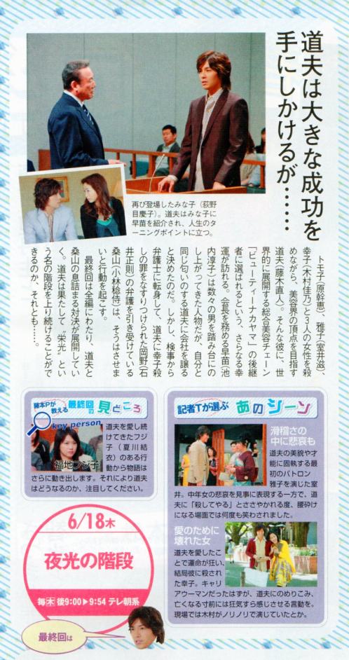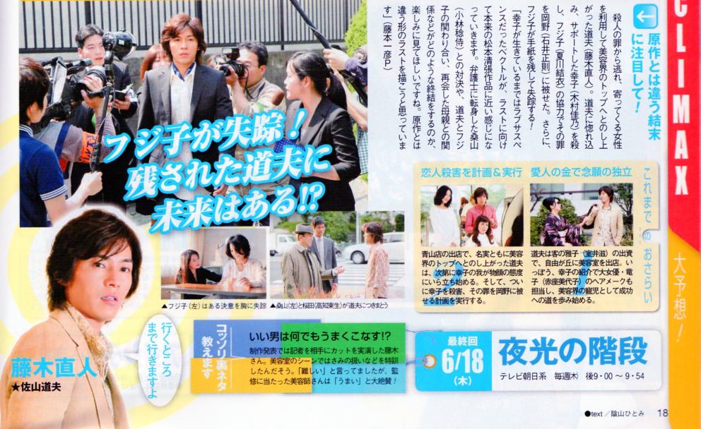 で、お留守番組みのワタクシは、 ひまなので、溜まってる紙もの情報を~(^∀^) まず、テレビ誌。 今回もあらすじ載ってますので、NGの方はクリックしないで下さい!(≧∇≦) 特にステーションは激ネタバレっす~(≧∇≦) ステーション 春ドラマ最終回なんとかって言うコーナー(^∀^) 夜光あらすじ イケそばあらすじ おしゃれ ぴあ 最終回なんとか~ ライフ 最終回なんとか~ 夜光あらすじ で、 金曜の読売新聞の夕刊 つづいては、掲載雑誌。 ARENA37℃ 掲載は合計4ページ。 CD発売イベントの模様が。 で、LIVEでゲットした紙ものですが、 裏サイト(Secret)の方にアップしました。 注:LIVE初日のレポのページにアップしてます。 激ネタバレになってます。NGの方はMy初日が終わってからご覧下さい。 ってことで、更に激しいネタバレも裏にアップしてます♪(^∀^) 今のところ、途中ですが。(^∀^) そうそう。 裏でも書いたんですが、携帯サイトのDメモで初日の藤木さんが。 ビジュNGの方は(*・・)σポチッとしないように!!(^∀^) つってもですね、肝心の左側からじゃないので、それほど大したことはナイ。(^∀^) PR