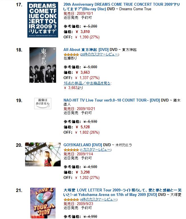 君には、ま~ったく縁のない学校だぞ?(^∀^) と、心の中で思ったけど口には出さず、「なんで?」と聞いておきました。(^∀^) どうも、愛しのななちゃんが早稲田祭に出るらしい。(^∀^) つっても、ラジオの公録らしいです。 行くつもりか?(^∀^) 行くつもりなのか?(^∀^) 母も名古屋に行きたいから、とめないよ?(^∀^) 泊まってきてもいいよ? 妹宅なら。(^∀^) んじゃ、食費もいらないし~(^∀^) 妹宅(千葉在住)に泊まるなら、ついでに佐倉高校にも寄ってくる?(^∀^) この先、どちらもま~ったく無縁の学校だし、記念に。(^∀^) 母のための。(^∀^) ついでに、写真でも。(^∀^) あなたは写ってなくていいから。(^∀^) って、長々と冗談言ってる場合じゃございません。(^∀^) ご覧になりました? ポニキャニさんと、熊さんメモ。(^∀^) どの曲にマルチアングルがついてるんだろお~?(^∀^) 10トラックとのことですが・・・。 一番気になってるのが、ダンサーバージョン。( ̄∇ ̄;) これ、10曲のうちの何曲なのかな? それとも、藤木バージョン10曲、プラスダンスバージョンがあるってこと? とにかく、ダンスがついてる曲はダンサーバージョンってことですよね?( ̄∇ ̄;) 一曲なのか、数曲なのかはわかりませんが。 勘弁してよ~~~~~~(^∀^) いらね~~~~(^∀^) ダンスしてる藤木さん、結構好きなんだから、藤木バージョンでお願いしますよ。( ̄∇ ̄;) 藤木さんバージョンがあって、プラスαダンサーバージョンがあるなら文句は言いませんが。(^∀^) あと楽しみなのは、シークレットトラック。 こちらは、熊さんメモにちょこっと詳細が。(^∀^) 楽しみだーーーーっ!(≧∇≦) 全部入ってたら嬉しいなあ~~~~( 〃∇〃) めっちゃ楽しみになってきた、ライブDVDはこちら♪(≧∇≦) NAO-HIT TV Live Tour ver9.0~10 COUNT TOUR~ [DVD] てか、藤木さんのだけだよ。 未だにジャケ写がアップされてないの。(^∀^) ちなみに、只今の順位。19位でした。 8月に見たときも20位でした。 こちらは安定してますね。(^∀^) 夜光は、40位くらいだったのが、一気に120位だったりしましたけど。(^∀^) 今日は、20位くらいをうろちょろしてました。(^∀^) どんだけ、チェックしてんねん!って?(^∀^) ハハハハハハ(^∀^) そうそう。 チェックと言えば、20世紀のDVDもチェックしてみました。 こちらは、絶好調!(^∀^) オリコンで二週連続1位だったようです!(^∀^) 二章ね、二章。 すっげー(^∀^) 参考までに、抜粋記事。 *********************************************************************************** 9日発表されたオリコン週間DVD&ブルーレイ(BD)ランキング(9月14日付)によると、DVD「20世紀少年 第2章 最後の希望」が約1万1000枚を売り上げ、2週連続で1位を獲得した。マンガ原作の映画が2週連続でトップを維持したのは、藤原竜也さん主演の「デスノート/デスノート ザ・ラストネーム コンプリートセット」(07年4月)以来、約2年半ぶりの快挙となった。 また、豊川悦司主演『20世紀少年-第2章- 最後の希望』が発売1週目となる9/7付週間Blu-rayランキングで、映画部門首位を獲得(総合2位)。 同作は初動売上7,717枚を記録し、同シリーズ第1弾『~ 終わりの始まり』(2009年1月30発売)の初動売上7,251枚を上回る好スタートを切り、邦画作品による最高初動売上となった。 (※アニメ作品は除く) ********************************************************************************** ちなみに、夜光はオリコンでは圏外で何位かさっぱりわかりません。(^∀^) あ。オリコンと言えば、こんな記事が。(^∀^) 忘れてた。(^∀^) ついでに、こちらも~(^∀^) HISTORY of NAOHITO FUJIKI Standard Edition これは、買う意欲をソソルものがこれといって無い・・・。(^∀^) う~ん。(^∀^) PR