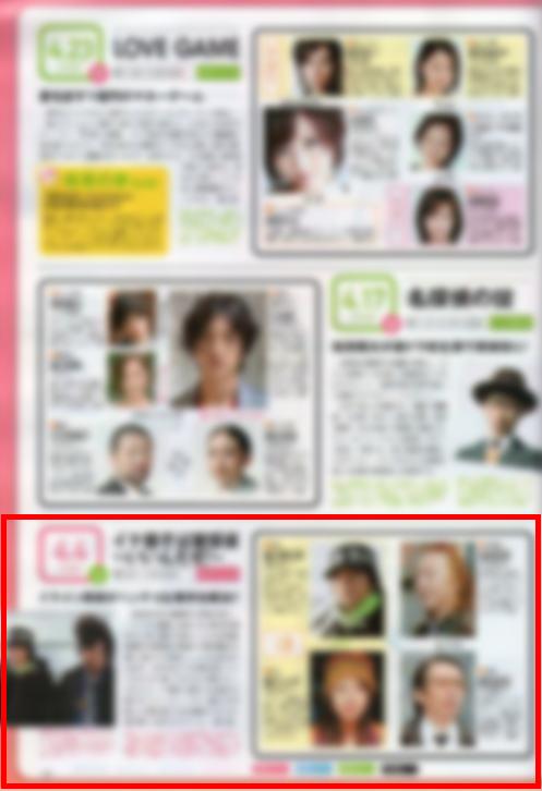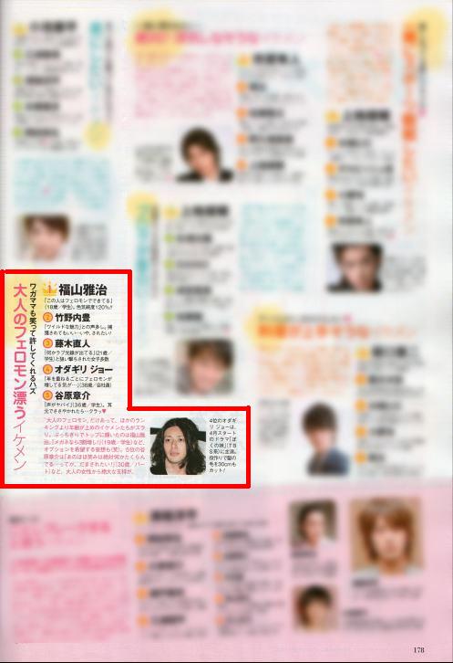 買ってきました。fan。(^∀^) いや~ 最寄の書店にfan売ってなくて~( ̄∇ ̄;) とりあえず、ジョンだけ買ってきました。( ̄∇ ̄;) ジョン以外は、週刊TV誌で既に記載されてるような内容ばかりでした。 って言っても、ジョンも例の相関図でしたが・・・( ̄∇ ̄;) ただ、ジョンにはイケそばもちゃんと載ってたのでお持ち帰りしてきました♪ 夜光もイケそばも1/3ページ分掲載。 他のドラマは取材時に撮影が始まっていなかったところが多かったのか、あまり相関図以外の画像は載ってませんでした。 が、夜光とイケそばワンカットづつ載ってました。 夜光は既に見たことのあるショットでしたが、イケそばは初です。 あとは、シバトラ。 相変わらず、放送日は未定となっております。。。( ̄∇ ̄;) ハッハッハッ で、番組欄ですが・・・ こちら夜光の初回。 ん~ 特に、初回拡大とかは無さそうです。。。。( ̄∇ ̄;) ハッハッハッ つづいて、日テレのあの長時間編集格闘番組。(^∀^) お名前が載ってたので一応。(^∀^) そして、そして! ありました!! 関西版にもちゃんと載ってましたよーーーーっ!!(≧∇≦)b 初回、4/14(火) 深夜 2:29~ !! 最後に、こちら。 イケメンLOVEKING(ランキングと読むらしい(^∀^)) なる、特集みたいなページが。 いろんな項目別にランキングされてるワケなんですが、 オシャレだと思うイケメンとか、一緒に旅行に行きたいイケメンとか~ まあ、ほとんどが若手の方ばかりで・・・。(^∀^) で、唯一かすりそう(笑)なこちらの項目。 “大人のフェロモン漂うイケメン” ってところに、ランキングされてました♪(^∀^) なんで、オダジョやねん。なんで谷原やねん。(∀`凸 最後に視聴率♪ 18.3% 21:00-22:54 TBS WBC緊急特別番組ワールドベースボールクラシック・準決勝「日本×アメリカ」 13.6% 21:00-22:09 CX* ヴォイス~命なき者の声~(終) 今期のドラマ、これで全部終了しましたね。 ついでに、平均視聴率。 14.51 ヴォイス~命なき者の声~ 14.50 キイナ~不可能犯罪捜査官~ 14.03 メイちゃんの執事 12.30 トライアングル 10.76 歌のおにいさん 10.64 ありふれた奇跡 10.33 特命係長・只野仁 *9.88 銭ゲバ *9.77 RESCUE~特別高度救助隊~ *8.79 ラブ・シャッフル *8.52 赤い糸 *8.18 本日も晴れ。異状なし *6.08 神の雫 ちなみに、2000年からこれまでの月9ランキング。 1・・・18位略 19 16.91 04/04 愛し君へ 20 16.89 00/07 バスストップ 21 16.89 05/07 スローダンス 22 16.17 03/01 いつもふたりで 23 16.05 00/01 二千年の恋 24 15.79 03/10 ビギナー 25 15.73 01/07 できちゃった結婚 26 14.95 07/01 東京タワー~オカンとボクと、時々、オトン~ 27 14.92 00/04 天気予報の恋人 28 14.51 09/01 ヴォイス~命なき者の声~ 29 14.45 08/07 太陽と海の教室 30 14.24 06/07 サプリ 31 14.19 05/01 不機嫌なジーン 32 14.08 07/07 ファースト・キス 33 13.83 04/07 東京湾景~Destiny of Love~ 34 13.70 02/10 ホーム&アウェイ 35 13.51 08/10 イノセント・ラヴ 36 13.16 03/07 僕だけのマドンナ 37 13.07 03/04 東京ラブ・シネマ 以上♪ fan手に入れたら、追記しますね~。 買ってきたので、追記♪(^∀^) いやいやいやいや・・・ 素敵っす!ヾ( 〃∇〃)ツ しかも、コメントが!!(≧∇≦) 「女性が見て、ドキドキするような作品にしたいです。」 だって~ヾ( 〃∇〃)ツ 楽しみにしております。(^∀^) あ。 後になってしまった( ̄∇ ̄;) 表紙です。 あとは、例の相関図。(^∀^) 上がイケそば。下がシバトラ。(^∀^) ラスト。(^∀^) PR