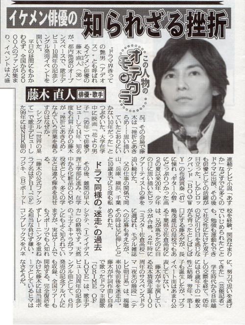 初めて知ったぜ。。。( ̄∇ ̄;) ハッハッハッ ってことで、告知のなかった「日刊ゲンダイ」(^∀^)アタリマエ? なんか、ワイドスクランブルでも取り上げられてたとか?(^∀^) 関東版に載ってても、関西版に載ってないことが多いんですが、 今回は載ってました。(^∀^) でも、 白黒でした!(≧∇≦) (-"-;) もう、日付変わったし載せちゃいます♪(^∀^) え? まだ日付変わってないやんっ! て?(^∀^) いや~ これアップした時間は、きっとナース→絵空を見てるはず。 藤木ファンなら。(^∀^) なので、ここに訪れる時には日付が変わってるはず。(^∀^) 日刊ゲンダイ@関西版 イベでの藤木さんのコメント「挫折と諦め、・・・・思い通りに行かない10年だった。」を受けて、 ゲンダイの記者さん、「ドラマ同様の、迷走の過去」と書かれてますが、 迷走?なのかな? ワタシは迷走とは思わないっすけどねー(^∀^) 思い通りに行く人生なんて、無いし。(^∀^) 例え万が一あったとしても、挫折を知らない人間なんて、魅力どころか豊かな人間にもなれやしない。 「豊かな人間になりたい」 これは「東京カレンダー」に掲載されてた藤木さんのコメント。 これ、素敵なことですよね。 多分、藤木さんは常に目標をもって生きて来たんでしょうね。 何かを目指して、前へ向かって人生を歩いていく人には、必ず壁は訪れるものです。 その都度、岐路も訪れるもので。 その目標に対して、努力したかどうかが大事だと思う。 結果がどうであれ、その過程での経験が全部自分のものになる。 無駄なことは一つも無いんです。 その時の選択にしても、そう。 突き進むのも勇気なら、諦めるのも勇気。 その時の自分が選んだことを、自分を信じてあげれば良いと思う。 後悔しない人生を歩んで欲しいですね。 たら、れば、は嫌いっす。(^∀^) 基本、後悔しない人間なんで~(^∀^)v てか、すぐ忘れる。(^∀^)v そうそう。 その「東京カレンダー」。 やっと、到着しました♪(^∀^) 藤木さんは、164ページに掲載。 合計、5ページ。 素敵な藤木さん満載です♪ で、さっきも話題にしましたが、 豊かな人間になりたい、ってのはホント良いっすね~( 〃∇〃) ちょっと違うかも知れないけど、 ワタシも自分が幸せでありたいと思ってます。 自分が幸せだと、周りにも優しくできるんですよねー。 自分に余裕がないと、周りにも・・・( ̄∇ ̄;) ま、ワタシっていう人間はそんな単純な性格なわけです。(^∀^) で、ゲンダイの記事にちょこっと戻りますが、 『イケメン俳優の知られざる挫折』 とのタイトル。 そして、「ドラマ同様の、迷走の過去」。 ゲンダイの記者さんはドラマの視聴率が10%前後を迷走中と書いてて、 で、上に書いてあるお題になったようです。 数字は残念ですねー。 藤木ファンとしては、内容だけじゃなく数字も結果が残せたら良かったのに、とは思います。 全てはスポンサーがつかないことには・・・、と言うことでしょうか。 芸能界も大変ですね。 でも、素敵なお仕事だと思います。 個人なんて他人に与える影響なんて、ごくごく僅かですが、 藤木さんが活躍されることによって、たくさんの方がいろんな影響を受けてる。 もちろん、ワタシもその一人です。 いや~ ほんと、藤木さんには感謝してます。 藤木さんを知ってから、どれだけ人生が楽しくなったことか。(^∀^) ありがとー ほんと、素敵な職業だと思います。 計り知れない大変さはあると思いますが、これからもワタシ(たちファン)のために、 前に進み続けて下さいませ。(^∀^) 俳優もミュージシャンも楽しみにしてます。(^∀^) どっちも続けてねー てか、十分に豊かで魅力的な人間でいらっしゃいますよ♪( 〃∇〃) つってもですね、素の藤木さんはま~ったく知りませんが。(^∀^) ワタシがわかる範囲で、十分魅力的だと言うことっすね。(^∀^) 俳優で例えるなら、 高杉も良いけど、やっぱ佐山が素敵♪( 〃∇〃) もうね、黒い藤木さんがこれでもか!ってくらい堪能できて幸せ~~~( 〃∇〃) 佐山、ヤバイよ、ヤバイ!( 〃∇〃) 内容はいろいろ突っ込みどころ満載ですが、 藤木さん演じる佐山は、ストライクど真ん中っす!( 〃∇〃) ひゃ~、この表情!( 〃∇〃) かっけ~~~~~~~~~~~~っ!( 〃∇〃) 爽やかで笑顔が素敵な役より、 悪くて、妖しくて、どこか哀しくて、ある意味人間臭いキャラ、大好きです( 〃∇〃) まったく人間臭くない、極悪非道な悪も大好きです( 〃∇〃) ヘタレなキャラも好き( 〃∇〃) チャラいキャラも大好き( 〃∇〃) とにかく、良い人キャラは嫌い、ってことです。(^∀^) 単純にカッコいい役も。(^∀^) あれ?(^∀^) キャラの話しになっちゃった(^∀^) 言いたいことは、年を重ねてこられた今演じてらっしゃるキャラが一番素敵、と言いたいわけです。(^∀^) って、全然説得力ナシ!って?(^∀^)エヘ♪ いや~ 何て言うんだろ。 同系統で言えば、モフランかな。 あれ、すっごい好きです。 脚本、演出、キャスティングどれをとっても夜光より良い。(^∀^) 藤木さん演じる路木も、かなり上