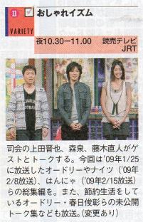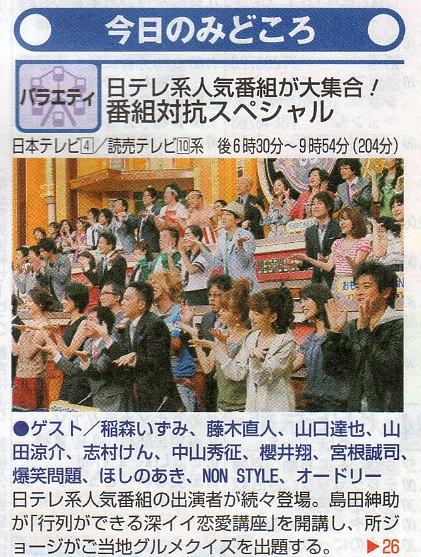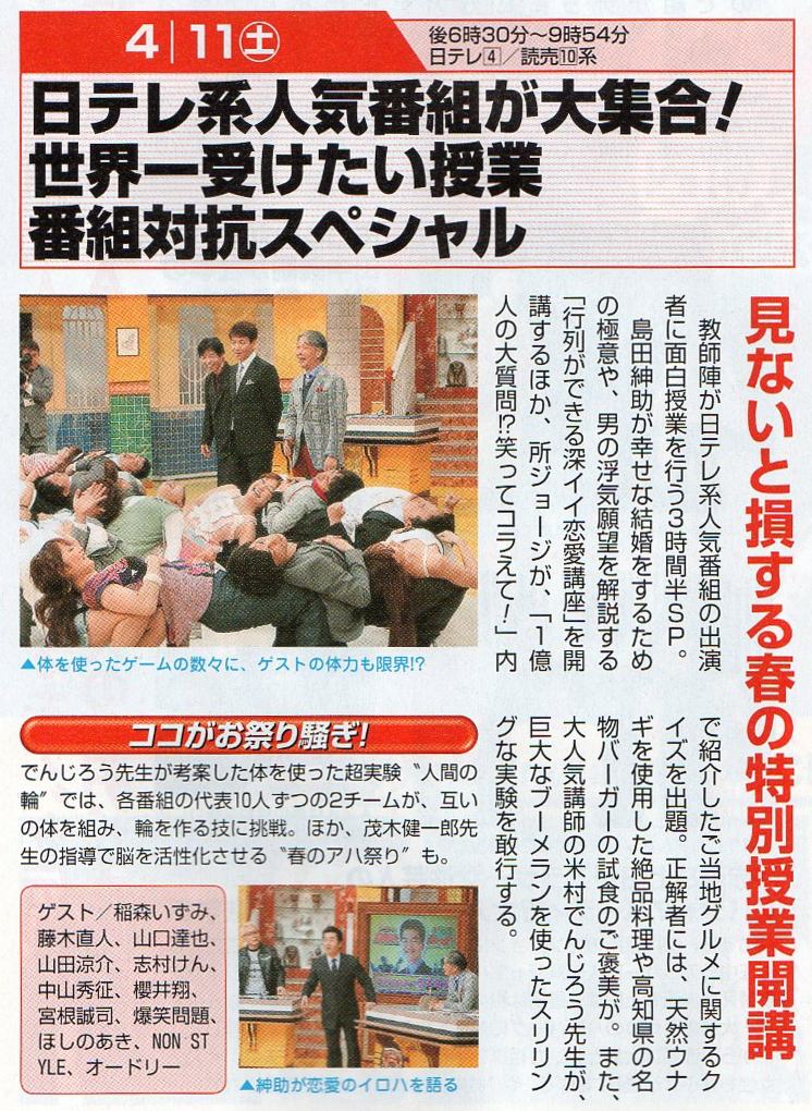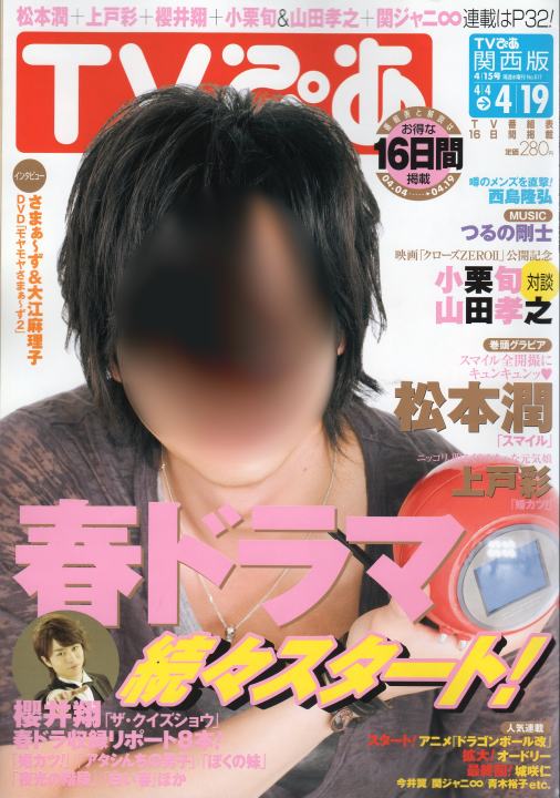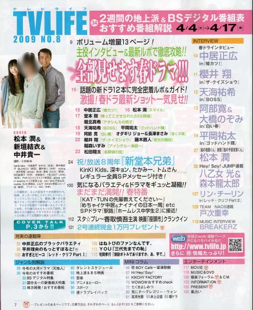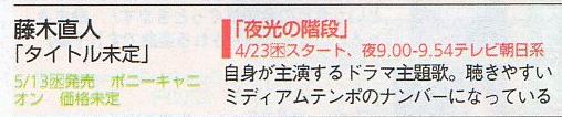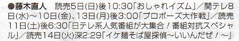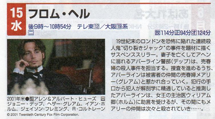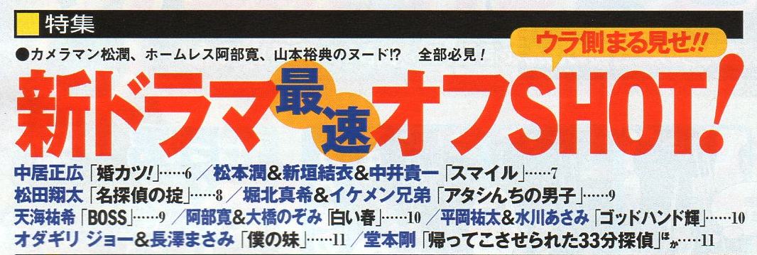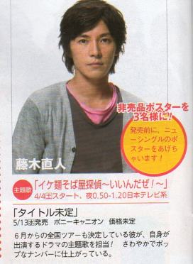 ジョン イケそばだけじゃん。(^∀^) で、そのお題や名前を載せてもらえなかったイケそばは、P11に。 ってタイトルがついて、お写真はギターをかき鳴らす樋口君。 でも、P33 「春特番・新番組」のコーナーにも樋口君が♪ P85 には「春うた」ってことで春ドラマの主題歌情報が~♪ で、「イケ麺そば探偵」の主題歌としては、こちらに載ってました♪ あとは、おしゃれ。 ライフ 表紙にお名前はありませんが、目次P22に「夜光の階段」藤木直人とありました。 「全部見せます 春ドラマ!!!」のTOPページに佐山が。 夜光はP22、1/3ページ。 お初の写真あり♪ あとは、オンエア日のページにイケそばの樋口君が。 最後に、次回予告。 一応お名前が出てたので~(^∀^) ぴあ 特にお名前も画像もなく~(^∀^) が、P14 に佐山が~♪ ステーション 「ピカピカの春ドラマ!」ということで、相関図付で紹介あり♪ まずは、P17 樋口君。 つづいて、P19 に佐山。 つっても、見たことのある衣装の佐山ですが。(^∀^) しかも、かなり小さい。(^∀^) そうそう。 ステーションだけかな? 日テレの「世界一受けたい授業SP」に、藤木さんのお名前が。 藤木さんが写ってるかどうかは、不明。(^∀^) オンエア日のページに載ってるといえば、樋口君も。 あとは、藤木さんのスケジュール。 関テレですが、またプロ大再放送するんですね~ あ。そうそう。 前に書いた春ドラマの勝手に評価の記事で、「臨場」初回見てみたいとか何とか書いてましたが、無理になりました♪(^∀^) く~~~~~っ!!(≧∇≦) ジョニーのアーバンライン警部は、かっけ~~~~っ!!(≧∇≦) ジョニー>>>>>>>>>>>>臨場 っす。(^∀^) 「フロム・ヘル」は、かの有名な切り裂きジャックのお話です♪ 注目の犯人は、少々変わった解釈で意外な方が・・・♪(^∀^) ちょっちエグい映像もあるので、おこちゃまにはオススメできませんが・・・(^∀^) なかなか面白いストーリーです♪ てか、結末が・・・ いい!!(≧∇≦) ジョニデのビジュを堪能するにも最適な作品です♪(^∀^) アヘンでらりってるジョニーや、お風呂タイムのジョニーまで見れる♪(^∀^) あ。 話しがそれちゃった♪(^∀^) 最後におまけ。 こちらは、月刊ローチケに載っていたものです。 ファンクラブへの入会案内みたいなページだったんですが、 あの公式写真じゃない!(^∀^) 昔のは知らないんですが、上の写真、初じゃないですか?(^∀^) もしかして、これが新しい宣材画像?(^∀^) ☆追記 調べたら、ポニキャニサイトもこちらの画像に~♪ って、これ書いてる間に、イケそばの本サイトがOPEN! 最後に、ガイドは買ってません。(^∀^) あんま載ってなかった~(^∀^) てか、全然載ってなかった~(^∀^) 多分。(^∀^) PR
