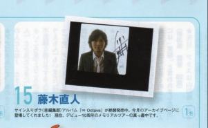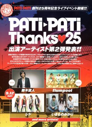 ちなみに、パチは雑誌も買ってきましたっ。(^∀^) 「Schedule in July 」に記載してるのは、 「PATi►PATi創刊25周年記念ライブイベント」の告知ページです♪ http://www.musicnet.co.jp/patipati/ http://www.musicnet.co.jp/patipati/thanks25/lineup.html 藤木さんは2009.9.12【SAT】にご出演♪ チケ予約は7/13(月)から♪ PATi►PATi 第2回 読者先行チケット予約受付! 7月13日(月)12時〜7月17日(金)18時まで受け付け。 お一人様4枚まで。抽選による先行販売となります。詳細はこちら! さてさて、まずはラジオから。(^∀^) ■ FM802 「フリップ・リップス」 11:00 ~ 「大阪のデータイムを明るく元気なデーライトに変える4時間!藤木直人が思う素敵な女性ってどんな人? http://funky802.com/flip/sofine/ ◇2時台ムラサキスポーツ SO FINE…藤木直人からコメント到着! 例のごとく、聴けない地域の方へ~ あ。 楽曲は流石に割愛してます(^∀^) てか、まさかのくるくる!(^∀^) 録りなおしたからかな?(^∀^) 「タイムトラベル2009」からいきなり始まりましたー(^∀^) 藤木さんのコメント スミマセン~ ノーマ・ジーンはもちろんワタシっす。( ̄∇ ̄;) 29歳なんてウソついてごめんなさい。(^∀^) しかもラテ欄で見つけたのはへぶんさんです。(^∀^) そして、加藤さん。 はじめまして。こんにちわ。( 〃∇〃) てか、藤木さんの声、低っ。(^∀^) 鼻声だし。(^∀^) 藤木さんの声じゃな~~~~~い。(^∀^) テンションも、低っ。(^∀^) 低すぎる。(^∀^) 寝起き?寝起き?(^∀^) コメント内容は、 藤木直人が思う素敵な女性ってどんな人?に関して~。 姿勢? ヨガ? やったことないんかいっ。(^∀^) 姿勢は、藤木さんも気をつけましょう。(^∀^) 特に座ってるとき。 猫背すぎ。(^∀^) ギター弾いてるときなんて、ギター横むいてるからね。(^∀^) 上を向いてると言うか。(^∀^) それでなくても、藤木さんてギター倒しがちなのに。 あれが気になって、気になって。(^∀^) 素敵な女性に似合う一曲ってことで、「横顔」をご紹介されてました。(^∀^) ぶちょおおぉお~~~~~~~っ!!( 〃∇〃) ではでは、雑誌情報♪(^∀^) ■ PATi►PATi 2009年8月号 <PATi►PATi ARCHIVE~25年の軌跡~> Vol.6 藤木直人 http://www.musicnet.co.jp/patipati/ 上記でご紹介した、「PATi►PATi創刊25周年記念ライブイベント」の告知ページにもWEBページと同じ藤木さんが写ってました♪ ARCHIVE~25年の軌跡~ vol.6 は、179ページに掲載。 合計3ページ。 ワタシ好みのお写真です。(^∀^) なので、皆さんにはどうかわかりません。(^∀^) こちらも例のごとく雰囲気だけ~(^∀^) こちらが、「PATi►PATi創刊25周年記念ライブイベント」の告知ページ。 この裏のページに・・・ そして、肝心の <PATi►PATi ARCHIVE~25年の軌跡~> Vol.6 藤木直人 あとは、プレゼント♪ 以上♪ てか、あのベストアルバムってリハ中に決まったの?(・∀・;) 急すぐる。(^∀^) とにかく、 あと数時間で静岡ライブがはじまりますね!(≧∇≦) 今日も楽しんじゃって下さいっ!!(≧∇≦) PR
